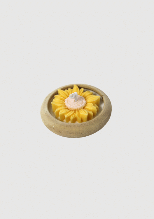 שעוות סויה טבעית בתוך כלי כרס עם צורת פרח החמנייה.