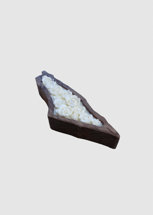נר ריחני יצוק לתוך כלי עץ בצורת ארץ ישראל, מעוצב מפרחים ריחניים ,