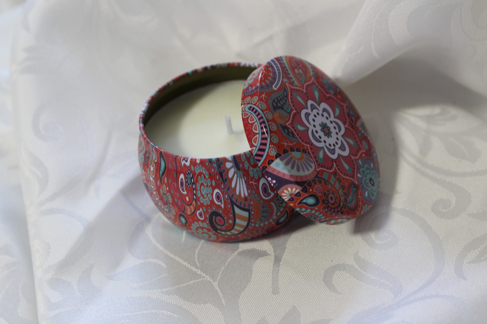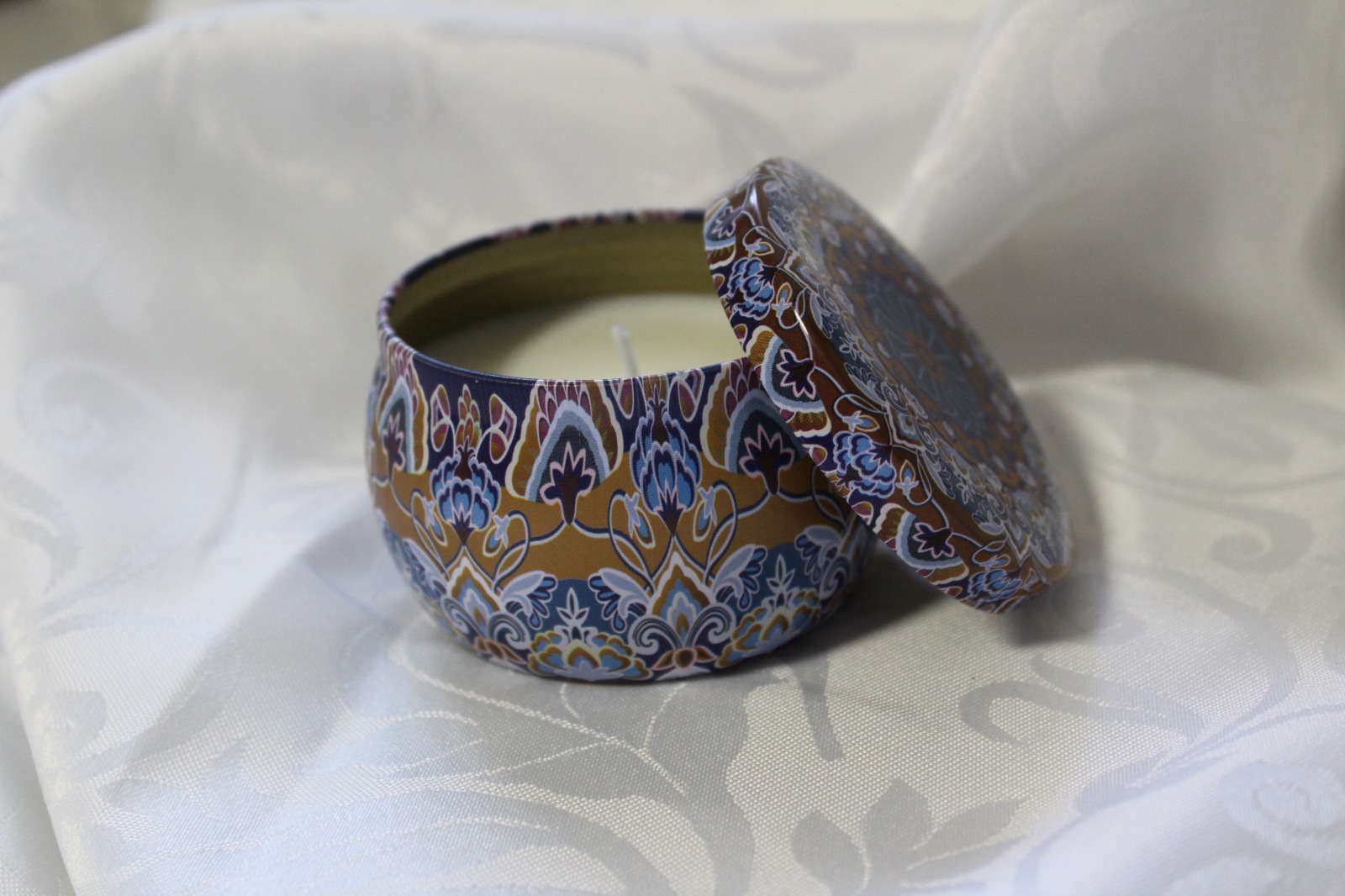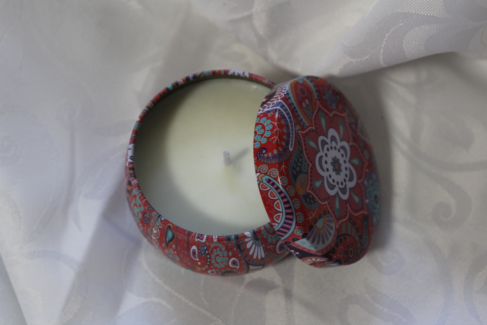נר יצוק לכלי מתכת רקוע עם מכסה , עשוי משעוות סויה טבעית 100%
