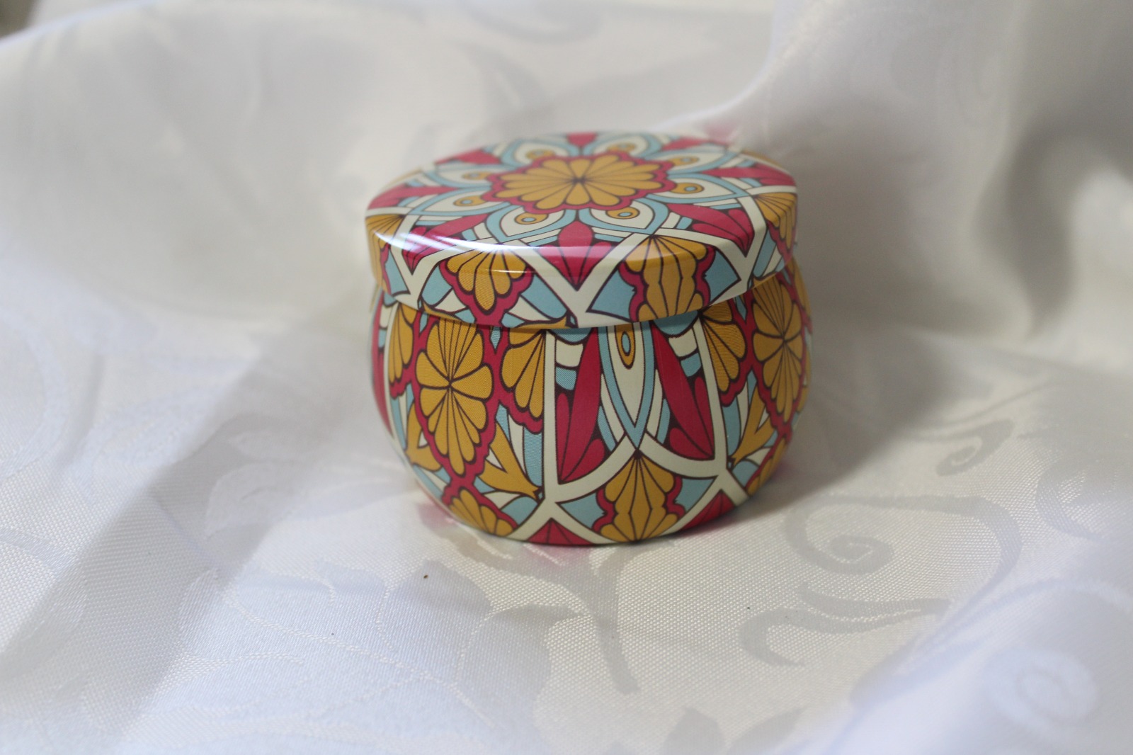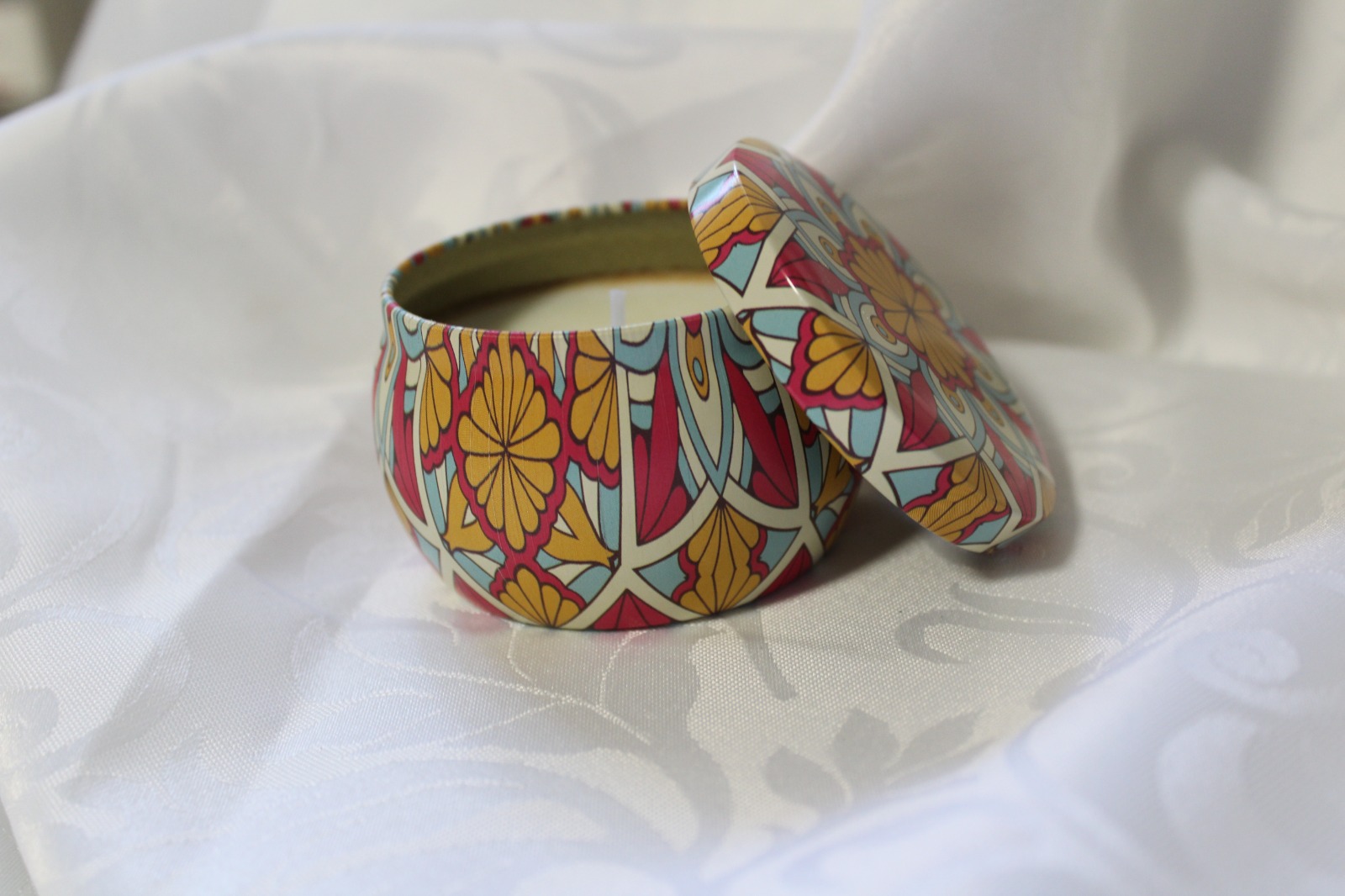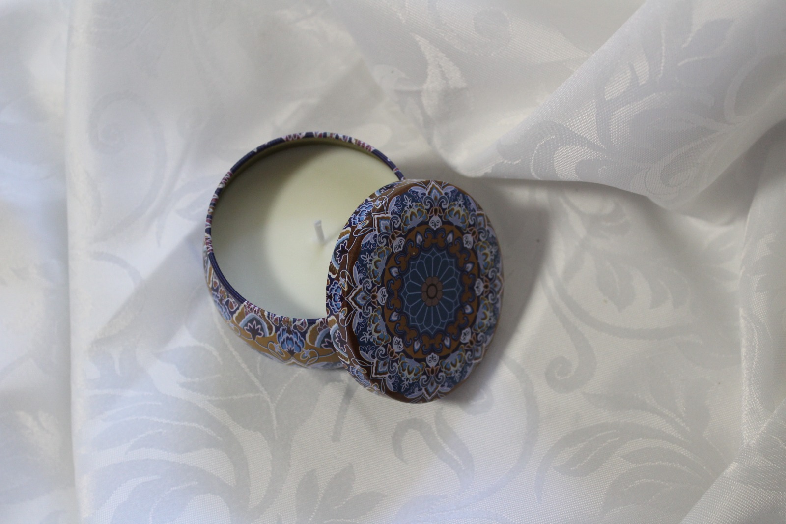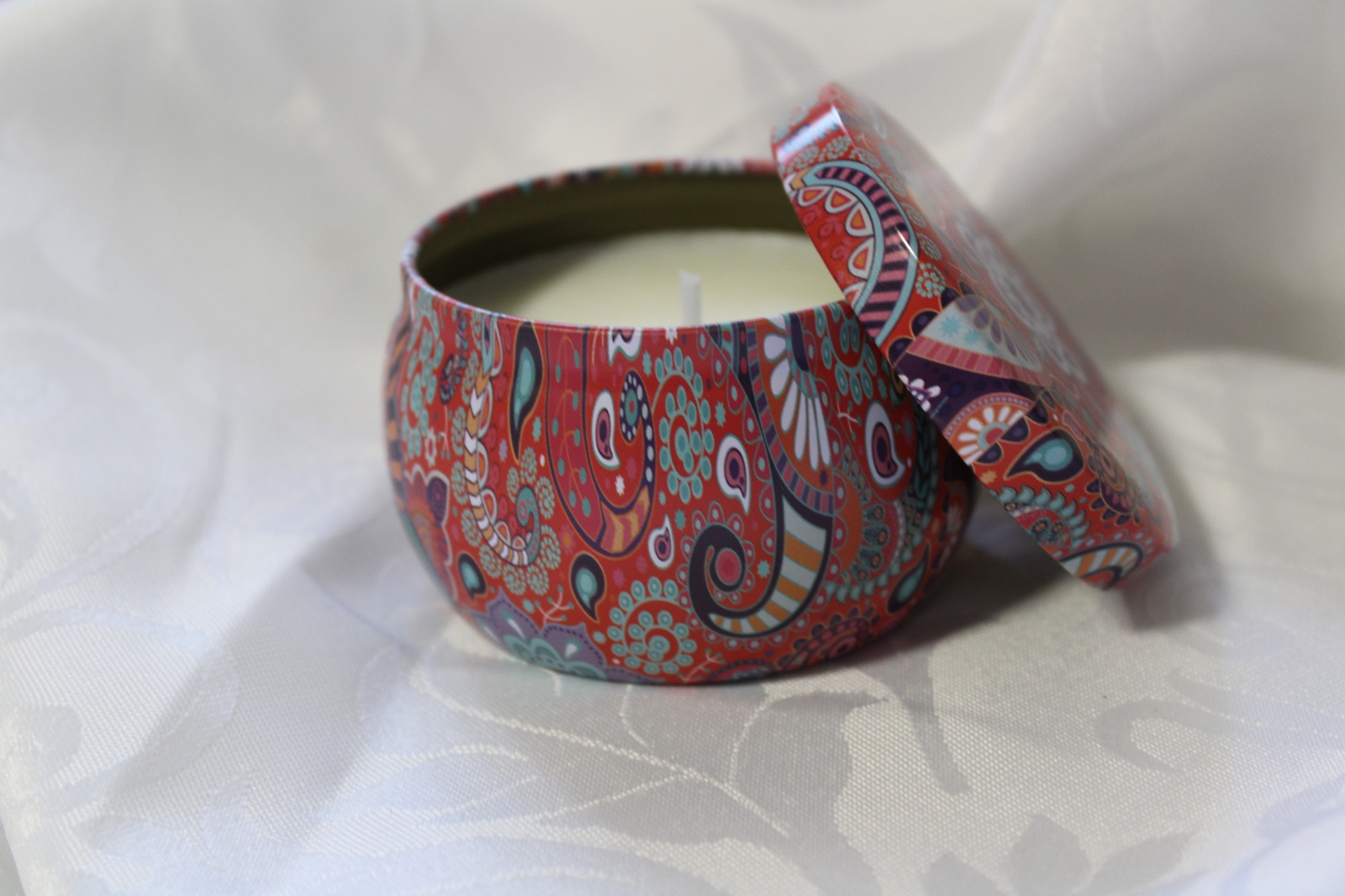 נר יצוק לכלי מתכת רקוע עם מכסה , עשוי משעוות סויה טבעית 100%